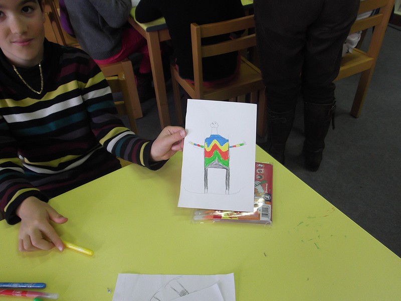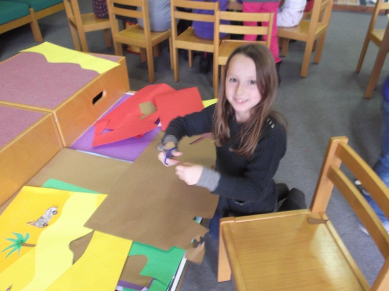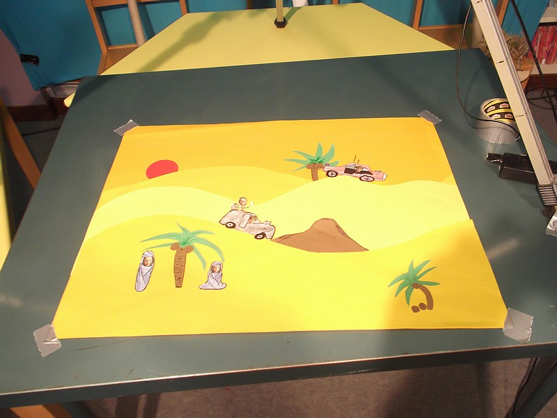 Je faisais partie du groupe "papiers découpés". Les autres membres du groupe se nommaient Hugo, Louis S, Nina, Anthony et Mathilde. Nous avons dessiné puis découpé un snowboader qui saute sur la bosse d'un chameau et disparait dans les dunes en replaquant. Puis deux 4X4 passent sur les dunes du désert et laissent la place à un chameau qui sort des dunes et s'en va.